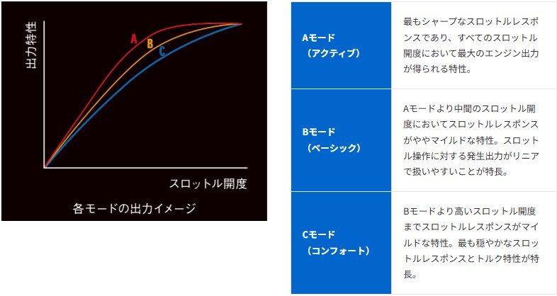 スズキドライブモードセレクター(SDMS)は、左ハンドルバースイッチにより、「A」・「B」・「C」の3つの走行モードから任意のモードを選び、エンジン制御マップの切り替えが可能です!