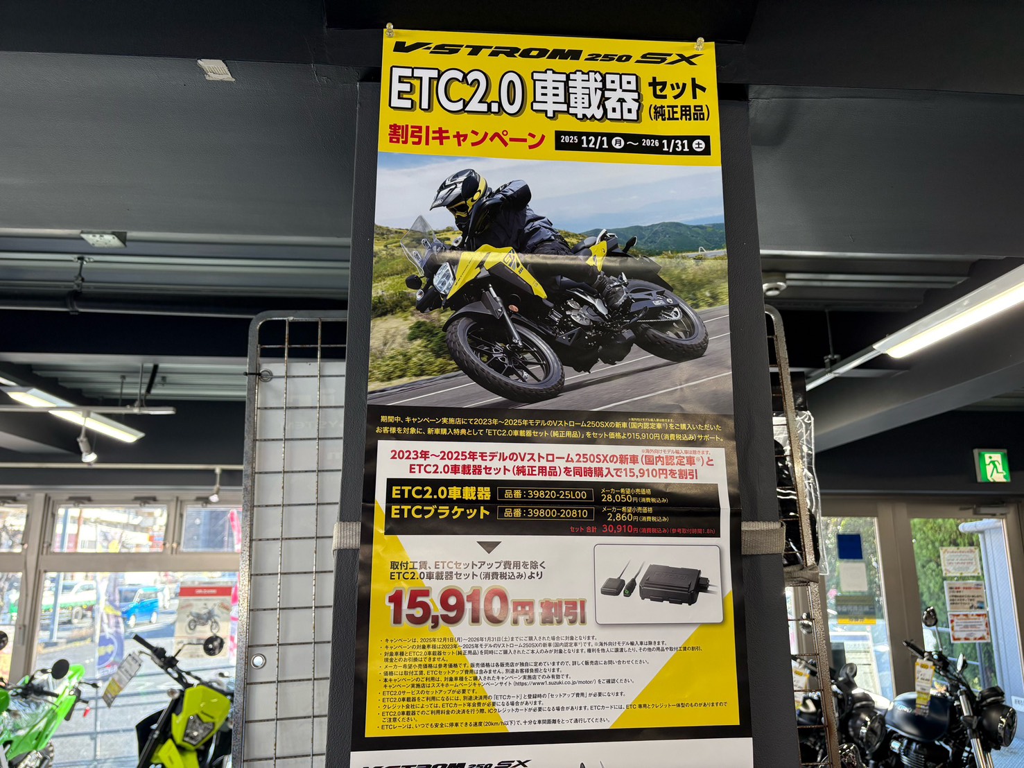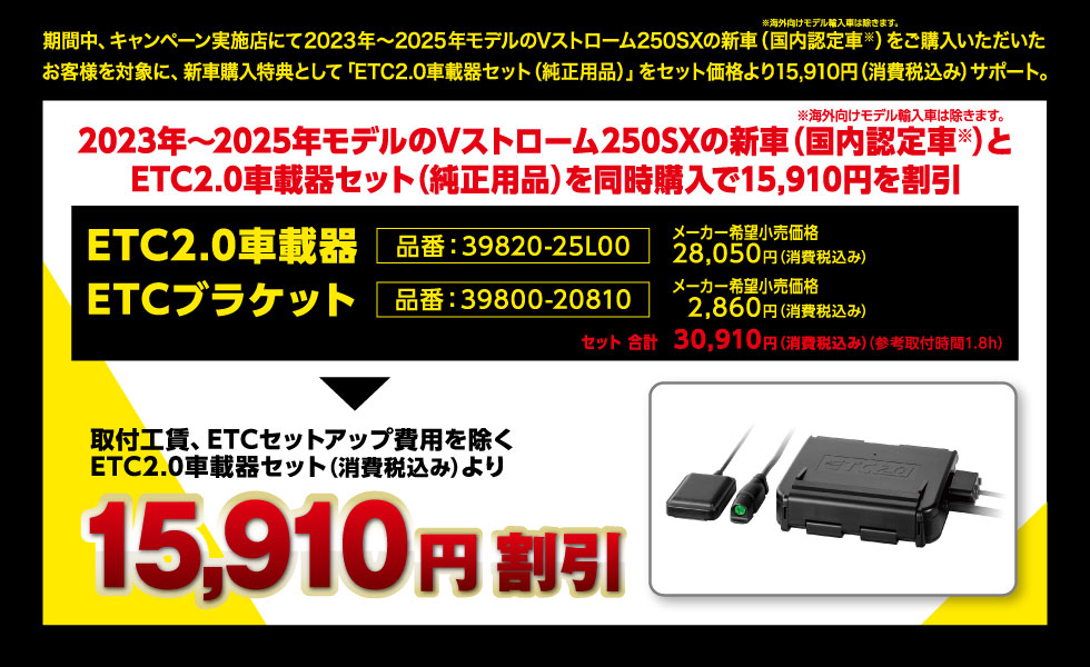 期間中、キャンペーン実施店にて2023年~2025年モデルのVストローム250SXの新車をご購入いただいたお客様を対象に、新車購入特典として「ETC2.0車載器セット(純正用品)」をセット価格より15,910円(消費税込み)サポートいたします!