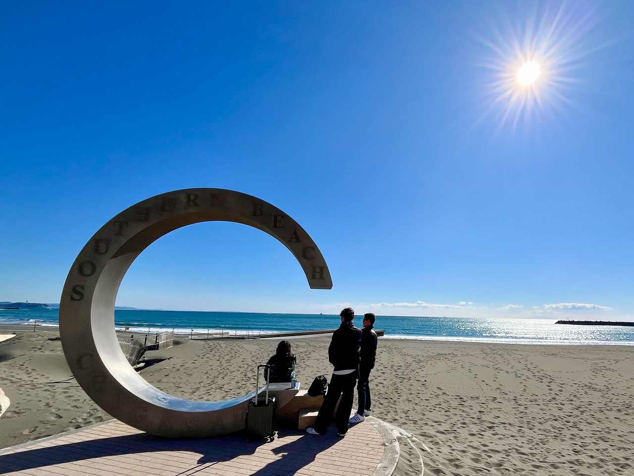 茅ヶ崎のシンボル「烏帽子岩」が見える、広々としたビーチ。