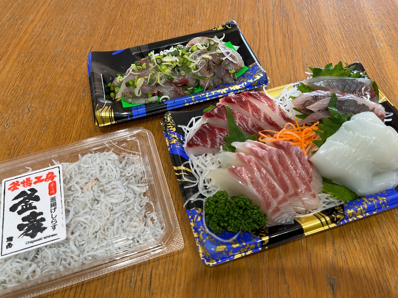 店頭では釜揚げしらすやしらすの佃煮などの土産物販売をしており、テイクアウトのしらす丼やミニ丼なども人気。