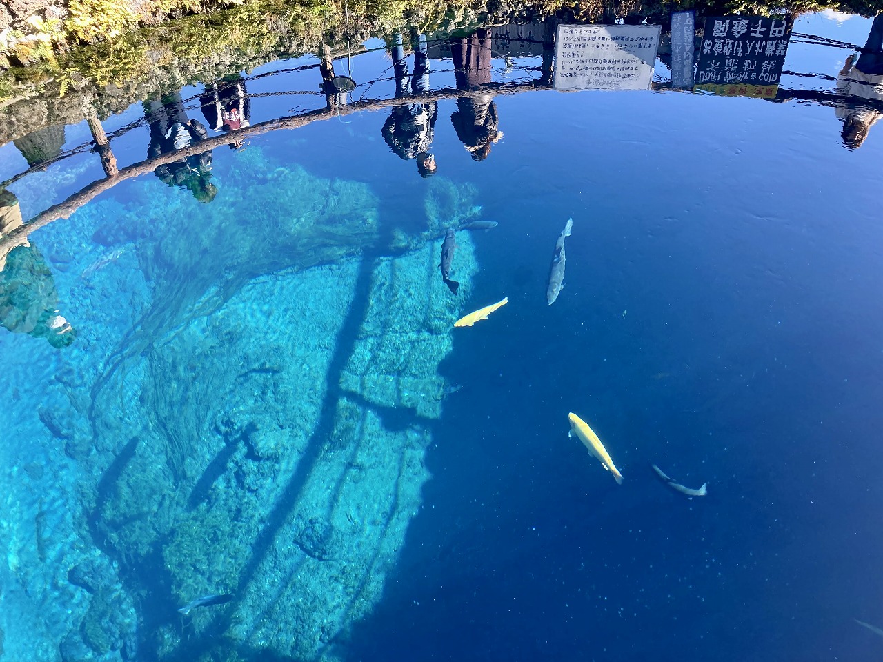 透明度の高い池にはコバルトブルーの湧水が溢れ、水底までくっきり見える様子に驚かされます。