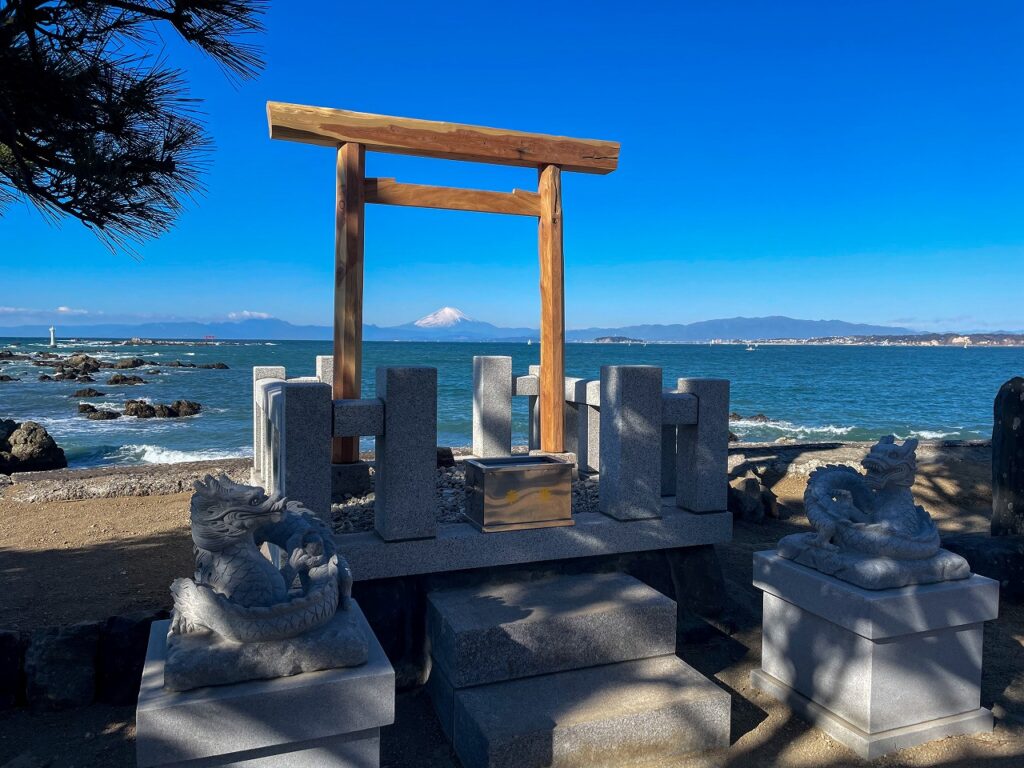 相模湾の海を背に建つ、美しいロケーションの神社。