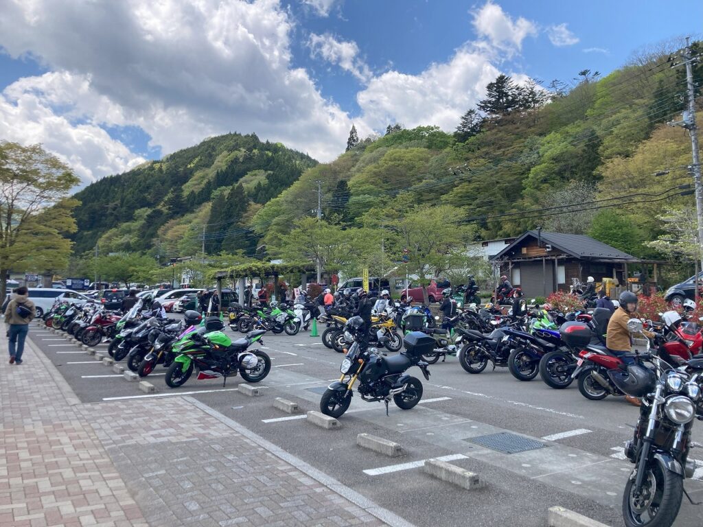道中の「道の駅どうし」は、バイク専用エリアも設置されており、週末はライダーで賑わうスポット。